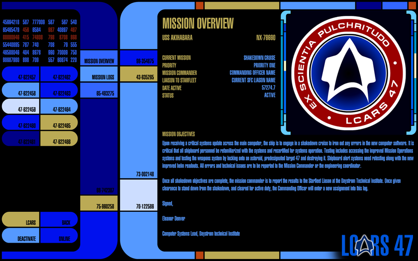 When I get on top of this my real dream is to have a built-in LCARS themed interface as a default for all screens. This will require some greater familiarity with the limitations and speed of Raphael as an interface library to implement. Chances are VOS will be released before this happens but it is a good upgrade path for V2.0 and I might even make a Kickstarter campaign out of it.